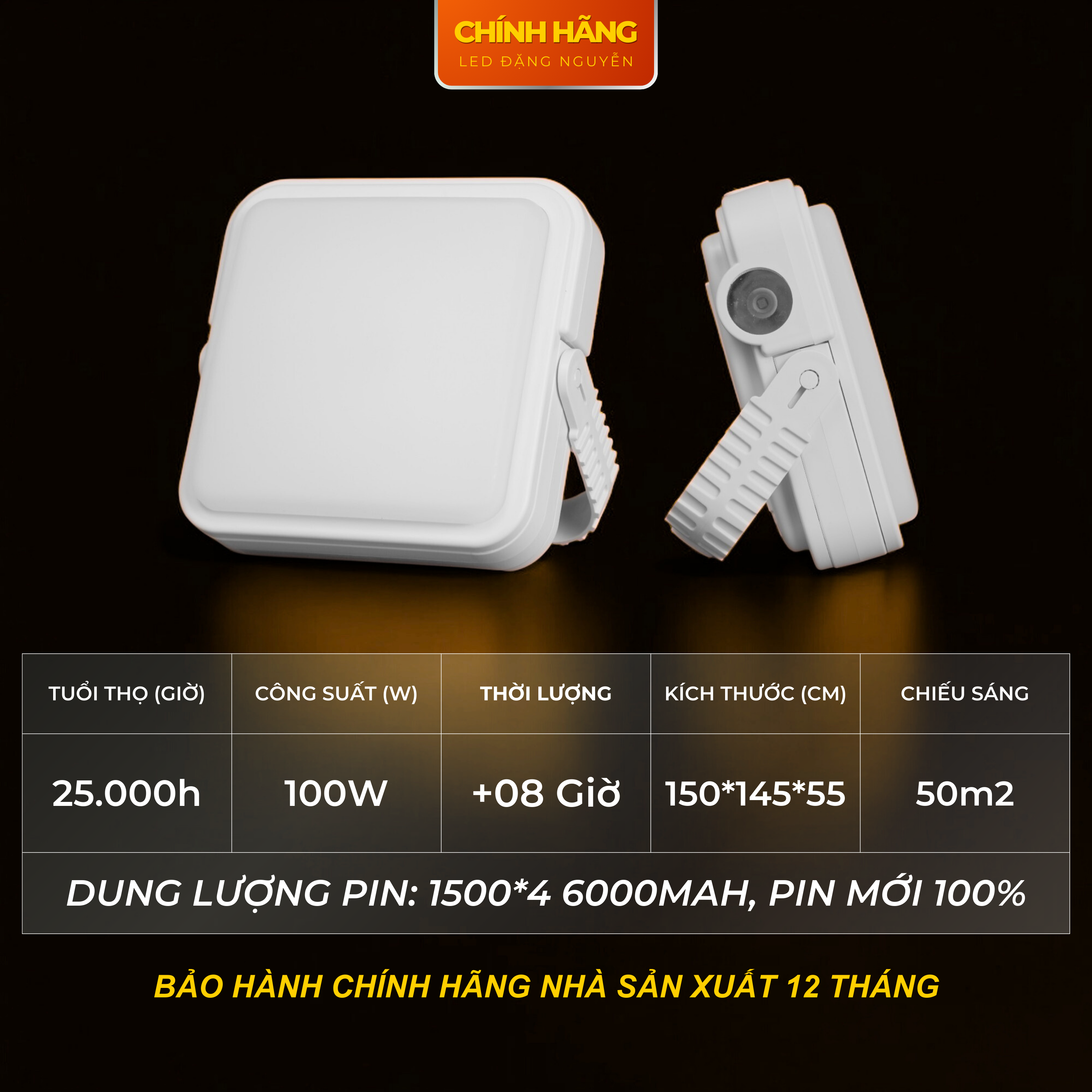 Công suất mạnh mẽ (100W): Đảm bảo cung cấp ánh sáng đủ mạnh để chiếu sáng hiệu quả, có thể sử dụng mà không sợ bị mất điện.
