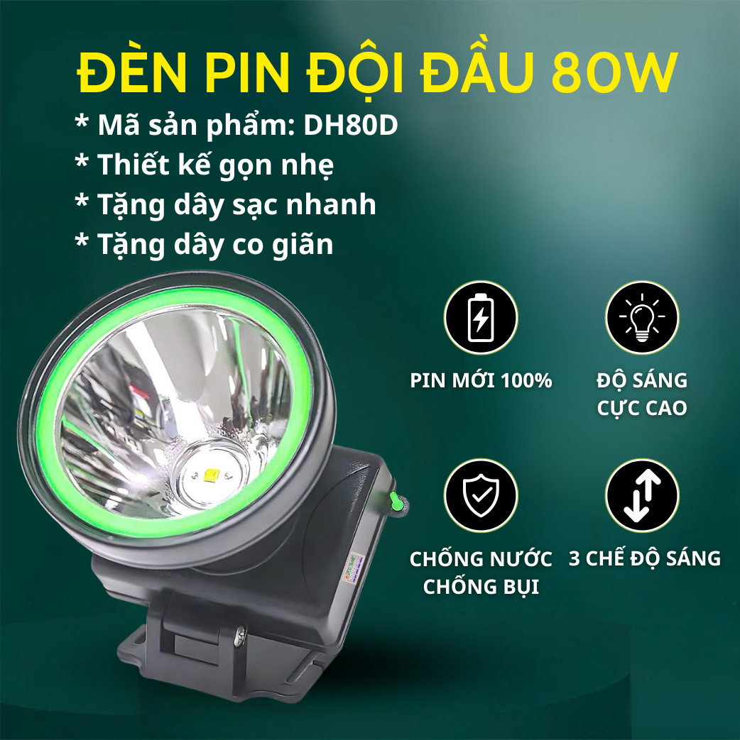 Với công suất 80W, đèn phát ra ánh sáng trắng rõ nét, giúp bạn quan sát tốt trong điều kiện thiếu sáng – dù là đi trong rừng, sửa xe, làm vườn hay vào ban đêm. Thiết kế đèn giúp chiếu xa và rộng, không bị chói mắt hay lóa sáng.
